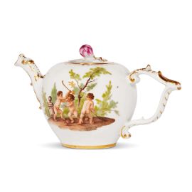 in porcellana dipinta in policromia e oro, corpo globulare rastremato verso il piede piano, beccuccio tenuto alto a forma di drago e ansa a J sagomata, coperchio piano con presa a forma di bocciolo. Il decoro a policromia mostra un gioco di putti, mentre l’oro profila i bordi e sottolinea anche le parti a rilievo del beccuccio e dell’ansa. Marca in blu sul fondo ed etichetta di provenienza Lukacs-DONATH ANTICHITÀ – ROMA; alt. cm 10, cm 5,2