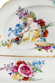 in porcellana dipinta in policromia, di forma ovale con vasca panciuta e due prese rocaille, coperchi sormontati da due putti a guisa di presa, un bimbo e una bimba con cornucopia accompagnati da una cascata di piccoli fioretti a rilevo, vassoi ovali di forma mossa con anse molto rilevate. Tutti i pezzi mostrano un decoro a grandi fiori naturalistici scontornati realizzati con grande perizia. Le due zuppiere trovano confronto in un’opera pubblicata da Fletcher ce datata come periodo di produzione attorno al 1770, come confermato dalla marca a spade incrociate accompagnata da un asterisco, riferibile al periodo Marcolini, presente sul fondo di zuppiere e vassoi; zuppiera cm 18x27x16, vassoio cm 24x37