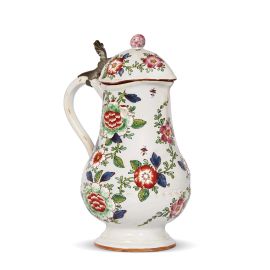 in maiolica policroma, corpo piriforme, imboccatura mossa e allungata su cui si innesta un coperchio legato all’ansa con un fermo di peltro coevo, coerente per forma appena a cupola sormontato da un pomolo a forma di piccolo frutto, piede alto e svasato ed ansa a orecchio. Il decoro a fiori a rilievo, detto "alla barbottina", è articolato su quattro tralci fioriti sovrapposti in verticale e da tralci a ramo che sostengono fiori secondari tra cui rose canine; orli e profili bruno-rosso e color senape sul piede; etichetta di provenienza QUESTA ANTICHITÀ – Torino sul fondo; alt. cm 23, diam. piede cm 9