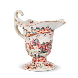 in porcellana dipinta in policromia con smalti nella “palette” della famiglia rosa¸ raffigurante una scena di interno con figura maschile intento a fumare, un piccolo fanciullo e una donna vicino a un tavolo. Le modalità pittoriche sono corrive, ma la scena è ricca di dettagli e mostra uno sfondo a paesaggio, decori minori e piccole riserve con vedute naturalistiche sul piede, di gusto più idonea al mercato interno piuttosto che all’esportazione, con figure di nobili in una scena di terrazza; cm 15,2x17x8,4