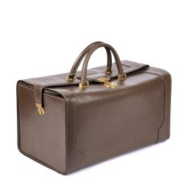 In pelle marrone, modello vintage di borsone da week-end semi rigido; con doppio manico e metalleria in ottone satinato. Interno in tessuto color banana.