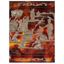 in tartaruga con intarsi a piqué posé in argento, di forma sagomata, coperchio decorato con scene di sacrificio con figure e animali entro paesaggio, retro ornato con volute e fiori, cm 1,8x7,5x5x5