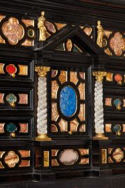 in legno ebanizzato, pietre dure e tenere, cristallo di rocca, e bronzo dorato di impianto architettonico. Il fronte, di forma rettangolare, è interessato da un ricco decoro geometrico a riserve in pietre colorate; la fascia superiore è scandita da quattro sculture in bronzo dorato raffiguranti allegorie delle stagioni, mentre quella centrale è inquadrata da quattro colonne tortili in cristallo di rocca a separare quattro serie di cassetti laterali e un grande cassetto centrale, su base modanata, cm 46x56,5x37,5