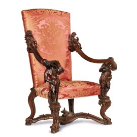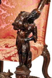 in noce riccamente intagliato alla maniera di Andrea Brustolon; braccioli sinuosi sormontati da figure di putti e terminanti in riccioli, sorretti da due figure di mori, su gambe sagomate intagliate con motivo a volute e foglie d'acanto e riunite con traverse da urna centrale, schienale e seduta di forma trapezoidale rivestiti in damasco rosso e oro, cm 136x100x79
