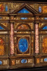 in legno ebanizzato, laccato e dorato con marmi e pietre dure. Struttura di forma rettangolare con fronte architettonico interamente decorato con motivi lumeggiati in oro e impreziositi da placche in diaspro, lapislazzuli, pietre dure e madreperla, caratterizzato da edicola centrale scandita da colonnine in diaspro a separare sei cassetti di diverse dimensioni e un cassetto che occupa tutta la fascia inferiore. Il tipo di decorazione, ad arabeschi lumeggiati d'oro su fondo scuro, dei listelli di legno che contornano i rettangoli, gli ovali e i triangoli di marmi variopinti, nonché la struttura fortemente architettonica della facciata del mobile, fanno ritenere lo stipo opera di anonimi artigiani veneziani. Al nostro stipo possono essere avvicinati l'esemplare conservato al Castello Sforzesco di Milano, quello attualmente nella Rocca di Soragna, e un esemplare pubblicato da Monique Riccardi Cubiti nel 1993; cm 50x59,5x34