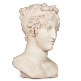 L'opera originale di Antonio Canova, realizzata nel 1811 e oggi conservata al Musée Fabre di Montpellier, viene considerata insieme alla testa di Elena come il primo esempio di testa ideale realizzato dallo scultore veneto (Possagno 1757 - Venezia 1822). Essa va messa in relazione al celebre ritratto di Elisa Baciocchi, con cui condivide l’elaborata acconciatura a piccoli riccioli, raccolti sulla nuca e fermati da nastri. Rispetto a quest’ultimo, tuttavia, Canova opera una decisa idealizzazione del volto, che perde la definizione realistica del ritratto per assumere i tratti perfetti di un volto ideale, rappresentazione universale della bellezza. Il marmo fu donato da Canova a Luisa Stolberg, contessa d’Albany, come ringraziamento per aver favorito l’importante commissione del monumento a Vittorio Alfieri, innalzato nella basilica di Santa Croce, a Firenze, nel 1810.