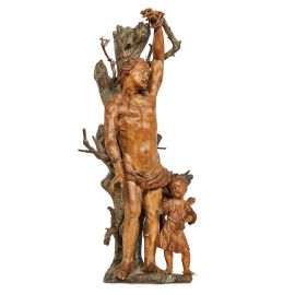 gruppo scultoreo in legno intagliato, patinato e dipinto, raffigurante San Sebastiano con il braccio sinistro alzato sopra la testa e legato al tronco alle sue spalle, vestito solo del perizoma annodato sul fianco e trafitto da frecce in metallo dorato, accompagnato da un angelo, cm 50,5x26x11,5
