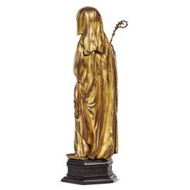 scultura in bronzo dorato, raffigurata stante in abiti monacali con il pastorale nella mano destra e un libro nella sinistra. Questa figura riproduce esattamente la statuetta che figura al centro della nota cassa-reliquiario di Santa Gertrude realizzata a Nivelles tra il 1272 ed il 1298 dagli orafi Colars de Douai e Jacquemon de Nivelles sotto la guida di Jacques d'Anchin, a somiglianza di una chiesa gotica in miniatura. Louis Marcy, falsario di origine italiana attivo a Parigi e Londra, ebbe la disponibilità dei calchi realizzati dall'originale nel 1897 per motivi di studio, e grazie ad essi produsse numerose figure tratte dal tabernacolo. La figura è montata su base modanata di forma esagonale in ebano; cm 32x13x10 complessivamente, bronzo alt. cm 28,2