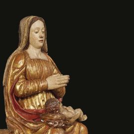 scultura in legno dipinto in policromia e oro, la Vergine raffigurata seduta con le mani giunte al petto e il Bambino sdraiato sulle sue ginocchia, secondo il tipico modello veneto. Quest’importante opera è stata attribuita con sicurezza da Raffaele Casciaro alla mano dell’intagliatore bresciano Maffeo Olivieri, attivo in Lombardia, a Venezia e in Trentino spesso in coppia con il fratello minore Andrea, che in essa vede gli sviluppi monumentali tipici della sua fase più matura, riferibile al ventennio 1520-1540; cm 105x58x32