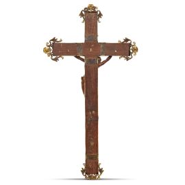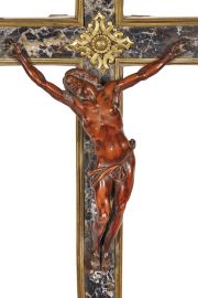 in legno lastronato in diaspro e bordato in bronzo dorato, con Crocifisso in legno di bosso finemente scolpito; terminali e applicazioni in bronzo dorato; cm 61x32,2 complessivamente; scultura cm 34x17,8