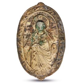 rilievo in lamina d'argento con tracce di policromia di forma ovale, la figura del Cristo racchiusa da una cornice lavorata a sbalzo con motivi vegetali. Al retro vecchia etichetta di collezione con numero in inchiostro bruno; cm 63,5x40