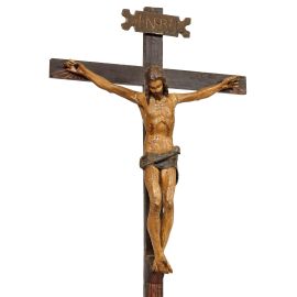 scultura In legno dipinto in policromia, accostabile per tipologia e qualità di realizzazione alle opere generalmente attribuite a Baccio da Montelupo, scultore attivo in Toscana a cavallo del 1500. La scultura è montata su una semplice croce in legno ebanizzato con cartiglio iscritto INRI e inserita su una base in legno intagliato ad imitare la collina del Golgota e centrata da un teschio; Cristo cm 42x38, complessivamente cm 107x37x13,5
