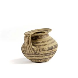 Coppa di medie dimensioni caratterizzata da largo labbro estroflesso, collo corto, corpo globurale e ansa a nastro ad innesto verticale (labbro/pancia). Decorazioni geometriche lineari definite da linee orizzontali scure, elementi geometrici ed ad archetto.