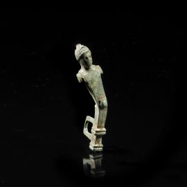 Piccola erma in bronzo finemente caratterizzata con dettagli resi ad incisione e applicati su tutto il corpo dell'oggetto. Ancora provvista di gancio posteriore. Verosimilmente parte di un meccanismo di chiusura.