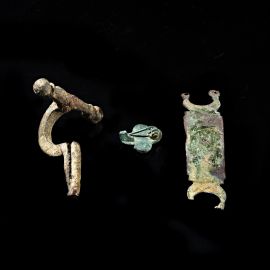 Tre elementi in bronzo; una fibula a croce caratterizzata da ampie estensioni terminanti in elementi tondeggianti e incisioni; una fibula a disco composta da quattro elementi concentrici decorati con inserti in smalto blu; una placca in lamina di bronzo dal corpo centrale piatto e rettangolare, terminante alle estremità con elementi configurati a mezzaluna dotati di fori di aggancio.