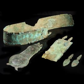 Quattro frammenti in lamina di bronzo appartenenti a cinturoni dotati di ganci configurati a palmetta e triangolari. Appartenenti a categorie molto diffuse nel Sannio e in Campania introno al IV secolo a.C.