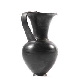 Oinochoe caratterizzata da ampio orlo, alto collo e corpo tondeggiante. Ansa singola innestata verticalmente tra orlo e spalla. Presenza di decorazioni incise sottoforma di linee orizzontali visibili sul corpo.