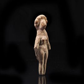 Statuetta raffigurante un soggetto femminile stante caratterizzato da ampio copricapo a corona composto da globi, ampi fianchi e braccia disposte lungo di essi. Il retro si presenta piatto.