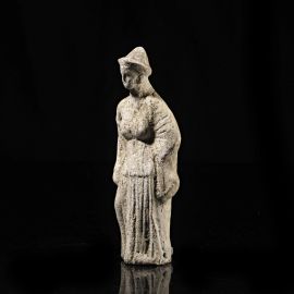 Soggetto femminile stante, caratterizzato da copricapo conico, himation e chitone plissettato. Il braccio destro corre laterale lungo il rispettivo fianco, mentre il sinistro poggia sul fianco piegandosi. La gamba destra è avanzata e questo nell'insieme ne enfatizza la plasticità. Internamente cavo.