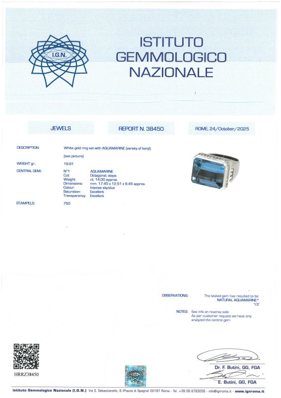 in oro bianco 18kt, al centro una grande acquamarina taglio ottagonale di ct. 14 circa, con diamanti taglio tappes e brillante per ct. 1 circa complessivi, punzone 750, mis. 14/54, gr. 18. Corredato di certificato IGN del 24/10/2025 attestante le caratteristiche.