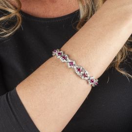 in oro bianco 18kt, composto da una serie concatenata di maglie geometriche impreziosite da rubini taglio ovale per ct. 4 circa e diamanti taglio brillante per ct. 6.50 circa, punzone 18kt, lungh. 19.3, gr. 29