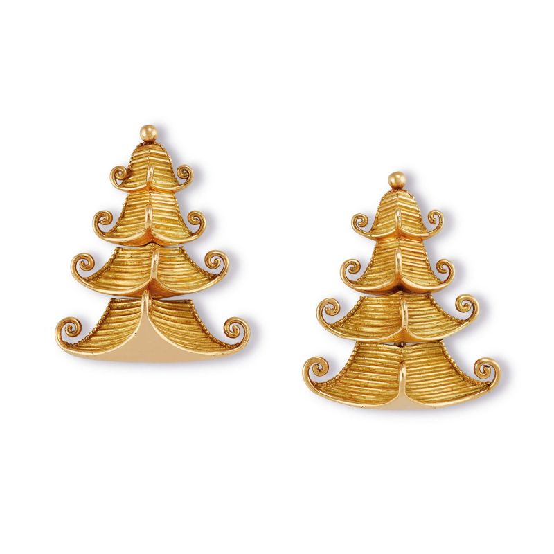 in oro giallo 18 kt, in stile orientale, un orecchino firmato Bulgari l' altro reca firma impropria, chiusura a clip, punzone 750, 18kt e marchio del fabbricante, dim. cm 5.1x4, gr. 48