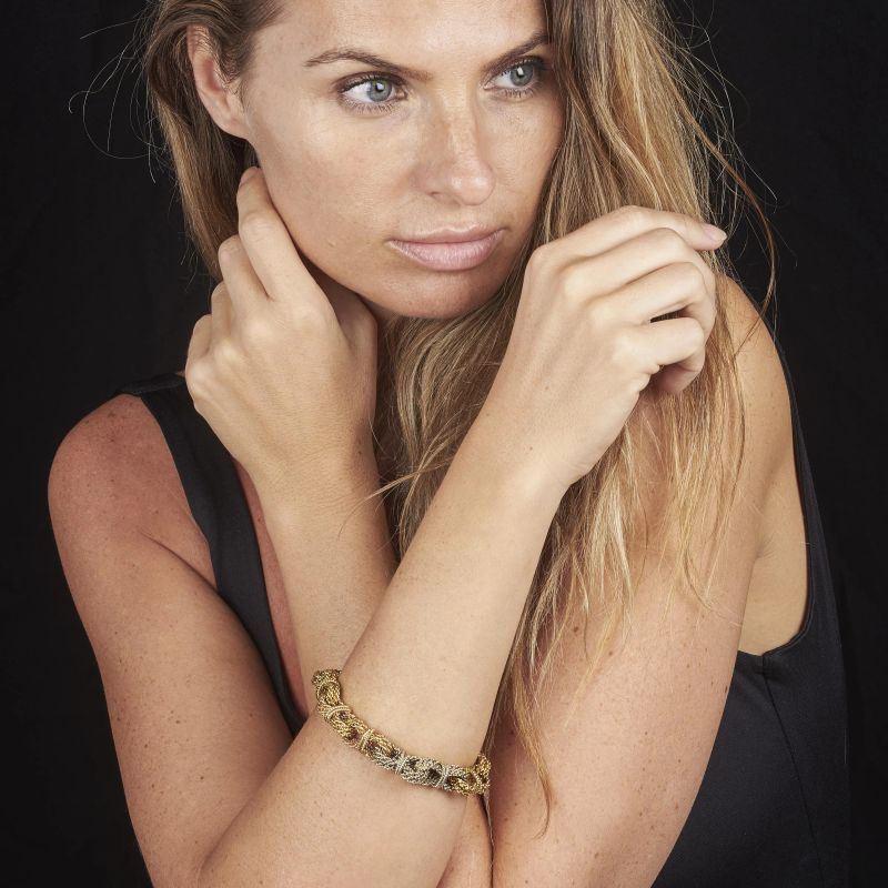 in oro giallo, bianco e rosa 18kt, composto da una serie di maglie annodate, firmato Bulgari, punzone 750, lungh. cm 22, gr. 94