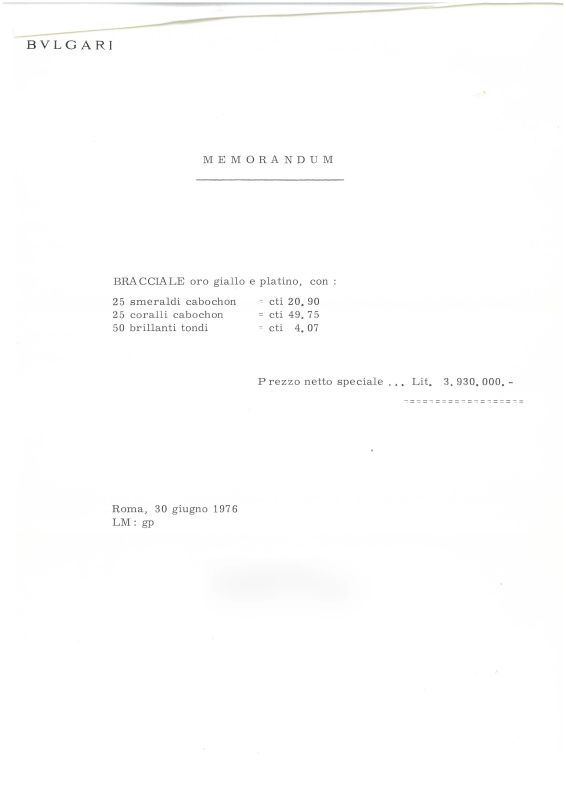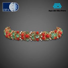in oro giallo 18kt, impreziosito da smeraldi taglio cabochon per ct 20 circa, coralli taglio cabochon e diamanti taglio brillante per ct 4 circa, firmato Bulgari, punzoni 750 del fabbricante, lungh. cm 18, gr. 63. Corredato di memorandum di acquisto del 30/06/1976.
