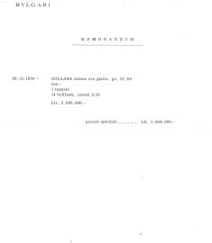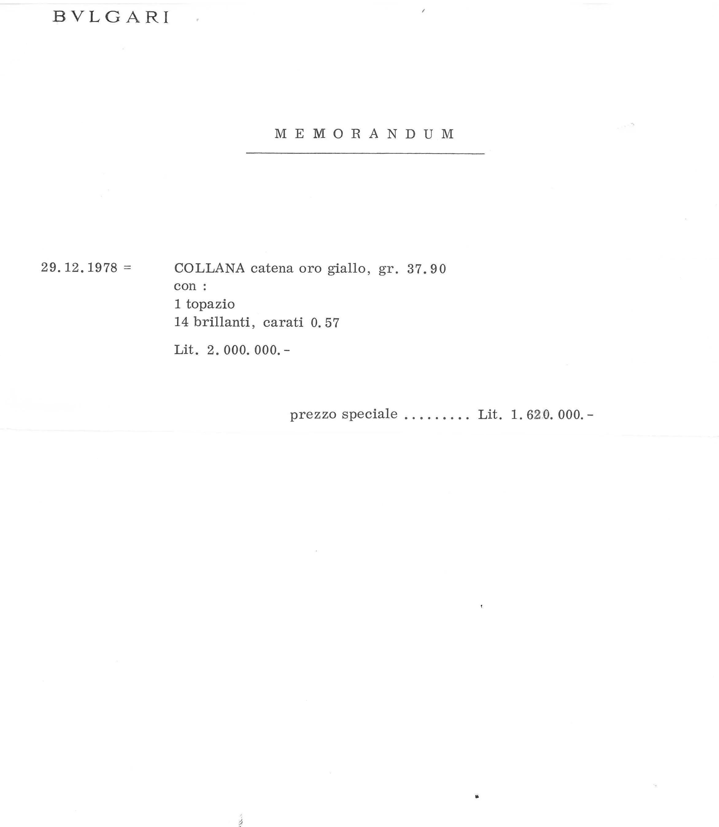 in oro giallo 18kt, impreziosita da un taglio cabochon e diamanti taglio brillante per ct 0.50 circa, firmata Bulgari, lungh. cm 38, gr. 37. Corredata di memorandum di acquisto del 29/12/1978.