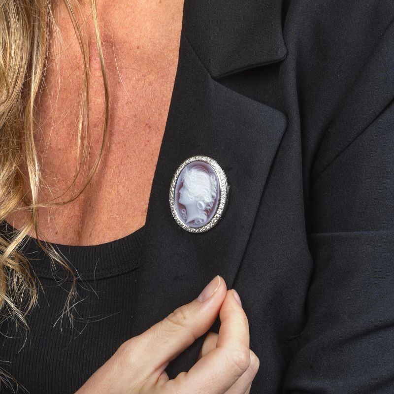 in oro bianco 18kt, al centro un cammeo in calcedonio inciso con volto di donna, circondato da diamanti taglio brillante per ct.1.30 circa, punzone 750, dim. cm 4.1x3.2, gr.13