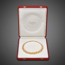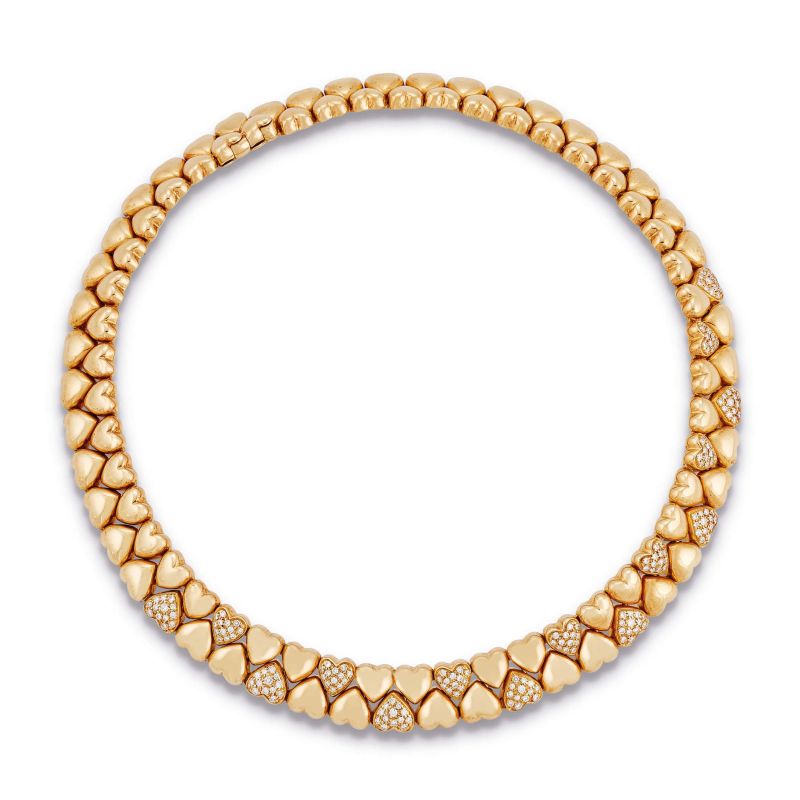 in oro giallo 18kt, composto da due file di cuori, con pavè di diamanti per ct. 2.50 circa, firmato Cartier, punzone 750 e del fabbricante, lungh. cm 40 circa, gr. 94. Corredato di scatola.