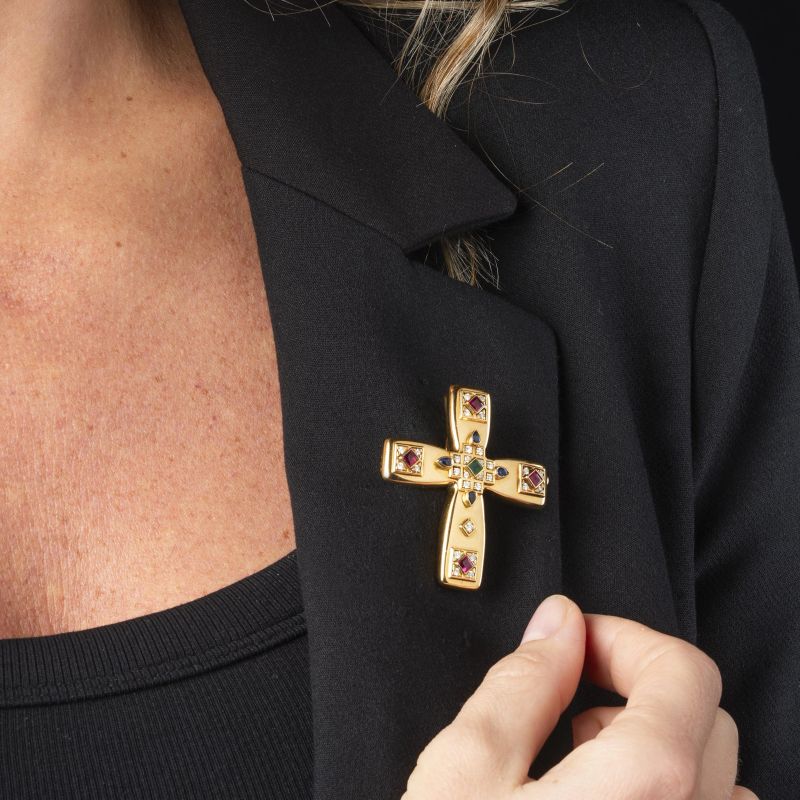 CARTIER SPILLA A FORMA DI CROCE CON DIAMANTI E PIETRE PREZIOSE