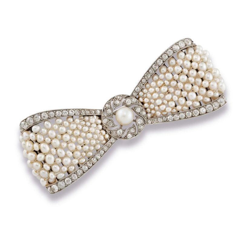 CARTIER SPILLA A FORMA DI FIOCCO CON PERLE E DIAMANTI
