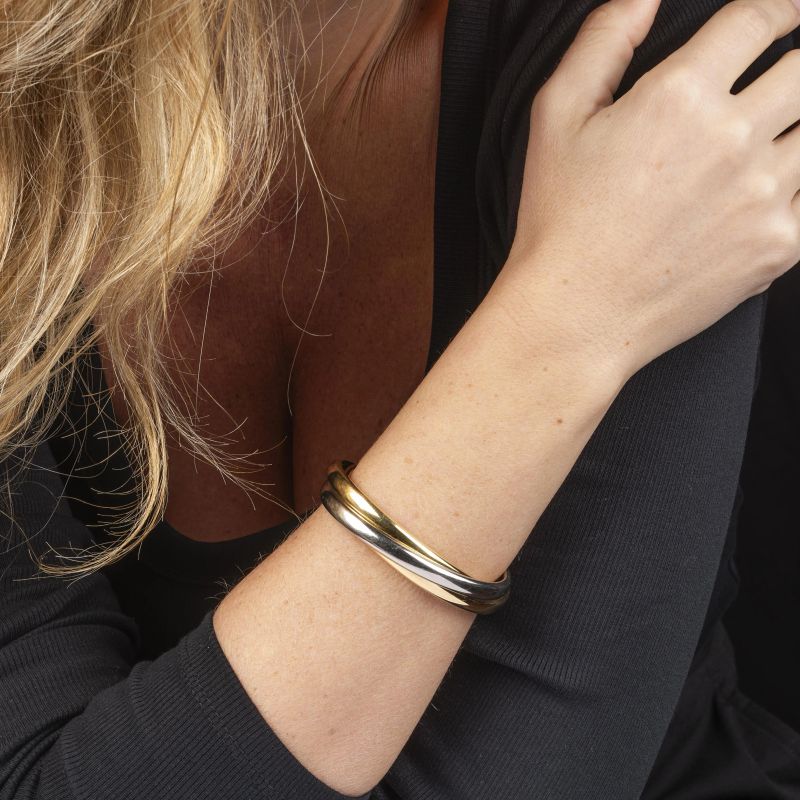 in oro giallo, bianco e rosa 18kt, firmato Cartier, punzoni 750, del fabbricante e n. seriale, dim. cm. 7x6 circa, circonferenza interna cm. 17, gr. 38.