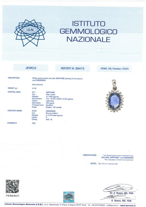 in oro bianco 18kt, al centro uno zaffiro Ceylon taglio ovale di ct. 4.80 circa, circondato da una fila di diamanti taglio brillante per ct 0.45 circa, punzone 750, dim. cm 2.5x1.3, gr. 4. Corredato di certificato IGN del 28/10/2025 attestante l'origine geografica della pietra e l'assenza di trattamenti termici.