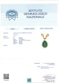 in oro giallo 18 kt, al centro un grande smeraldo taglio a goccia di ct. 12 circa, circondato da diamanti taglio brillante per ct. 0.50 circa, dim. cm 4.3x2.2, gr.13. Corredato di certificato IGN del 17/09/2025 attestante l'origine geografica della pietra.