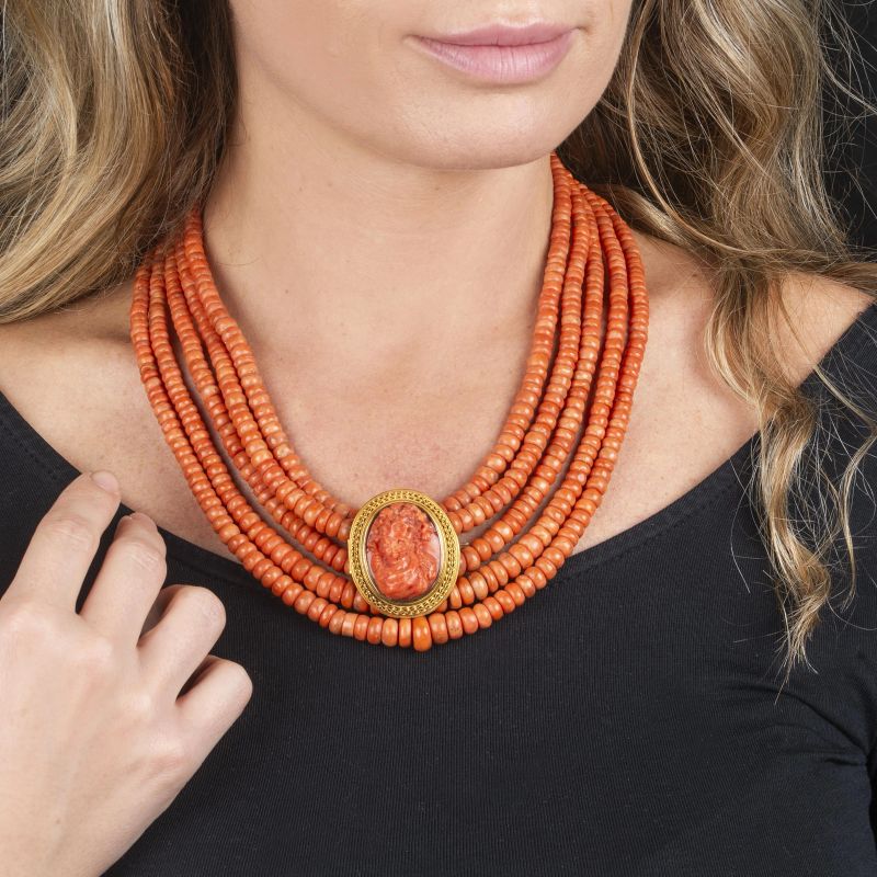 realizzata a cinque fili di corallo digradanti a taglio a rondella di mm 11.5-3.5, al centro un cammeo in corallo raffigurante una figura maschile, cornice in oro a cordicella, lungh. cm 47, gr. 208