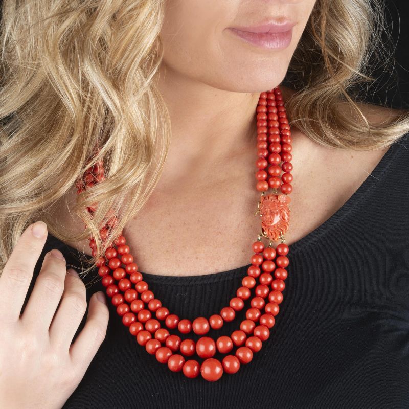 composta da tre fili di corallo digradanti di mm 6-12 circa, fermatura in oro giallo 18kt impreziosita da un corallo inciso raffigurante un volto, punzone 750, lungh. cm 59 circa, gr. 195