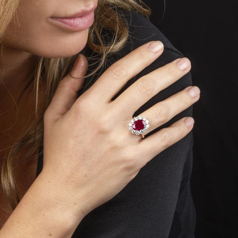 in platino, al centro un rubino taglio ovale di ct. 3.40 circa, circondato da una fila di diamanti taglio brillante per ct. 1.80 circa, punzone pt, mis 14/54, gr. 7. Corredato di certificato IGN del 23/09/25 attestante l'origine geografica della pietra e l'assenza di trattamenti termici.
