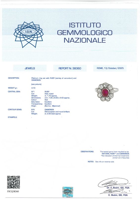in platino, al centro un rubino birmano taglio ovale di ct.1.70 circa, circondato da una fila di diamanti taglio antico per ct.2 circa, mis. 19/59, gr. 4. Corredato di certificato IGN del 13/10/2025 attestanti l'origine geografica della pietra e l'assenza di trattamenti termici. Con scatola