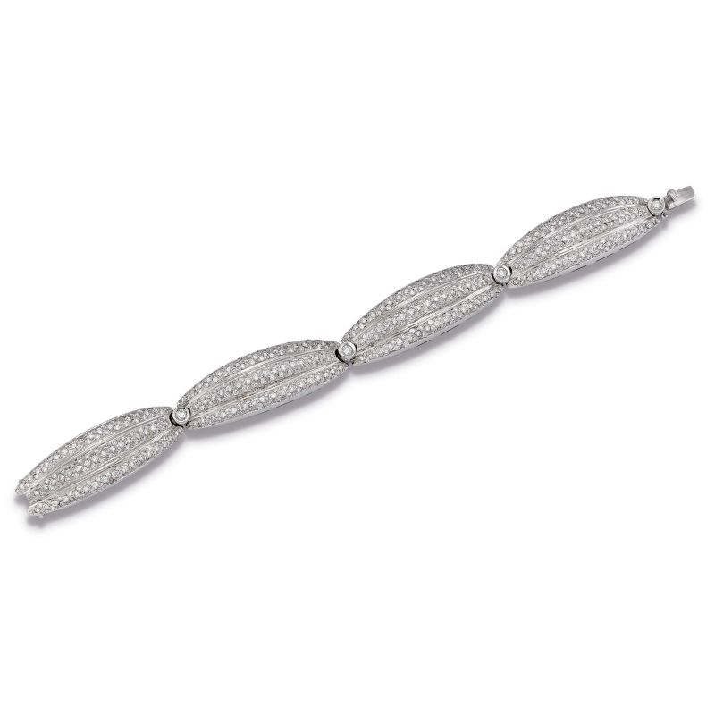 in oro bianco 18kt, composto da una serie concatenata di maglie geometriche impreziosite da diamanti taglio brillante per ct. 11.50 circa, punzone 750, lungh. cm 18.2, gr. 60