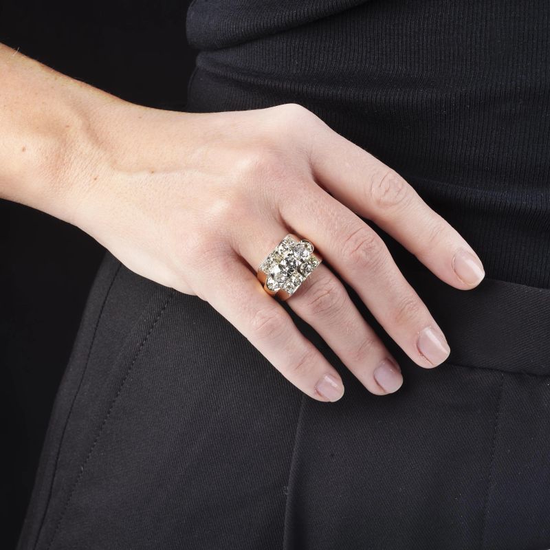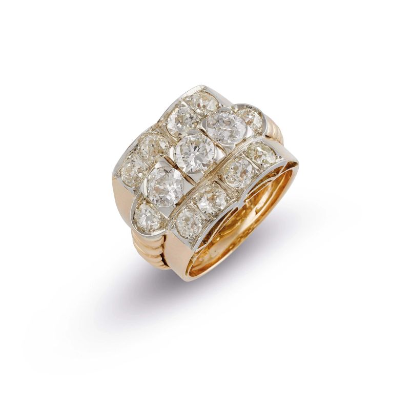 in oro giallo 18kt, al centro un diamante taglio brillante di ct. 0.50 circa, circondati da diamanti taglio antico per ct. 4 circa, punzone 750, mis. 18/58, gr. 12