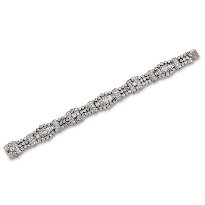 in platino, composto da una serie di maglie rettangolari concatenate impreziosite da diamanti taglio huit huit e baguette per ct. 4 circa complessivi e diamanti taglio brillante per ct. 5.50 circa, punzone del fabbricante, cm. 17.5, gr. 42