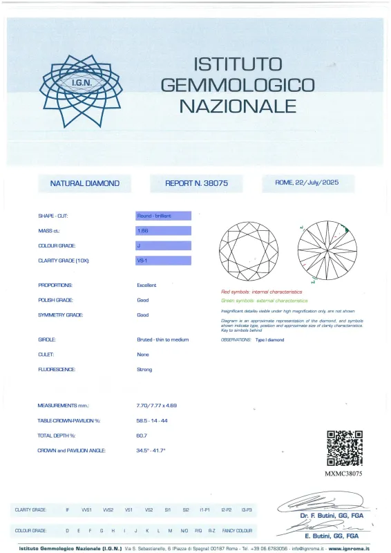 in oro bianco 18kt, diamante centrale di ct 1.66, colore J, purezza Vs1, circondato da una fila di diamanti taglio huit huit per ct 0.10 circa, mis. 13/53. Corredato di certificato IGN del 22/07/2025 attestante le caratteristiche.