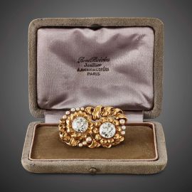 in oro giallo 18 kt, motivo a foglie incise, con coppia di diamanti taglio antico per ct. 5.60 circa, dim. cm 4x2,5 , gr. 13. In scatola Renè Boivin.