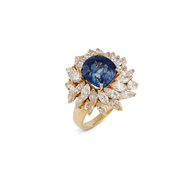 in oro giallo 18Kt, al centro uno zaffiro taglio cuscino di ct. 6.50 circa, circondato da una doppia fila di diamanti taglio navette, ovale e brillanti per ct. 3 circa mis.16/56, gr. 11.