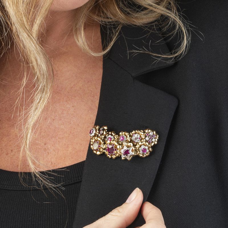 in oro giallo 18kt, fiori mobili impreziositi da diamanti taglio antico e triangolo per ct. 1 circa, rubini sintetici taglio misto, firmata Furst, dim. cm 6x2.5 circa, gr. 28
