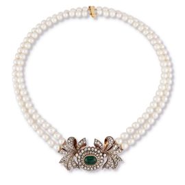 PEARL NECKLACE WITH EMERALD AND DIAMONDS