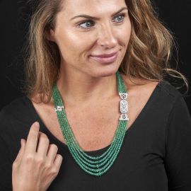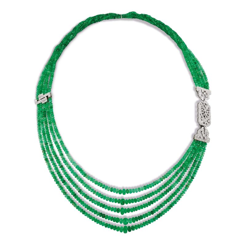 realizzata a cinque fili di smeraldi sfaccettati, fermatura e distanziale in oro bianco 18kt, impreziosita da diamanti taglio brillante e huit huit per ct 2.60 circa, punzoni 750 e del fabbricante, lungh. cm 57, gr. 69