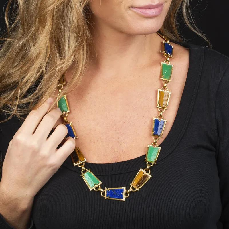 in oro 18kt, composta da una serie di maglie a forma geometrica impreziosite da pietre dure incise con ideogrammi, in giada, lapis, occhio di tigre, diamanti taglio brillante per ct 5 circa, firmato Massoni, punzone 750, lungh. 79.5, gr. 213